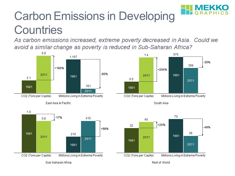 What is clear is that the regions that have seen extreme reduction in poverty have increased their carbon emissions by almost 200%. The only exception is Sub-Saharan. Sub-Saharan Africa has seen the number of people living in extreme poverty almost double while their carbon emissions severely reduce.